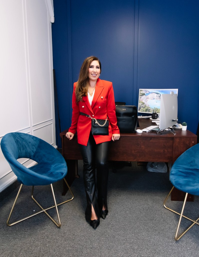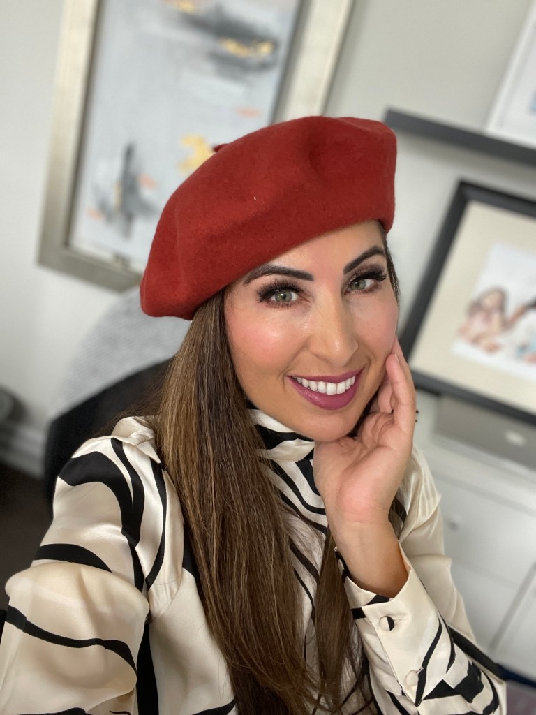 Another pant to consider is the wide-leg vegan leather pant. I love how long your legs look when you do a high-waist wide leg. I paired mine with a blouse for a work look, and topped it off with this hat for some serious “Emily in Paris” vibes.